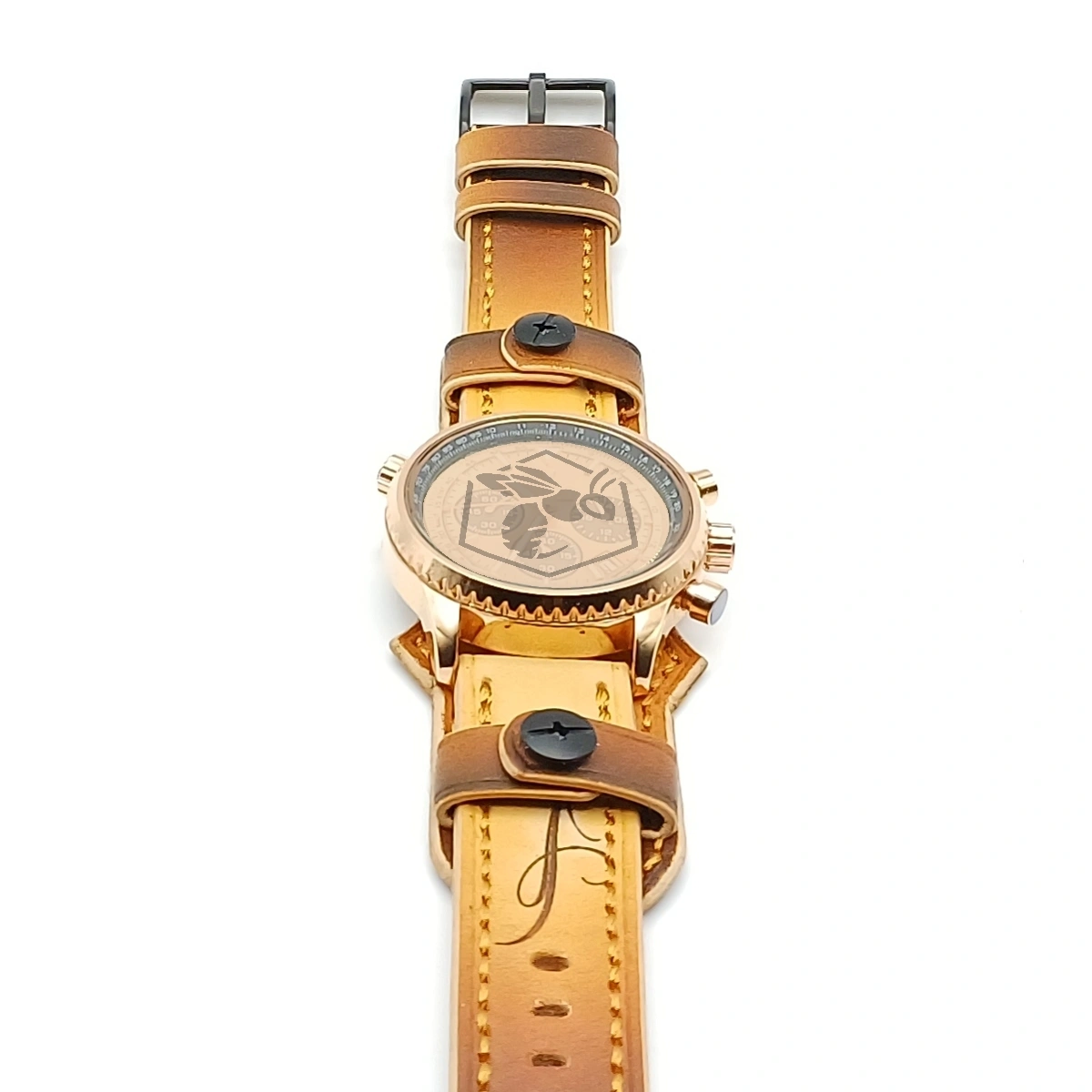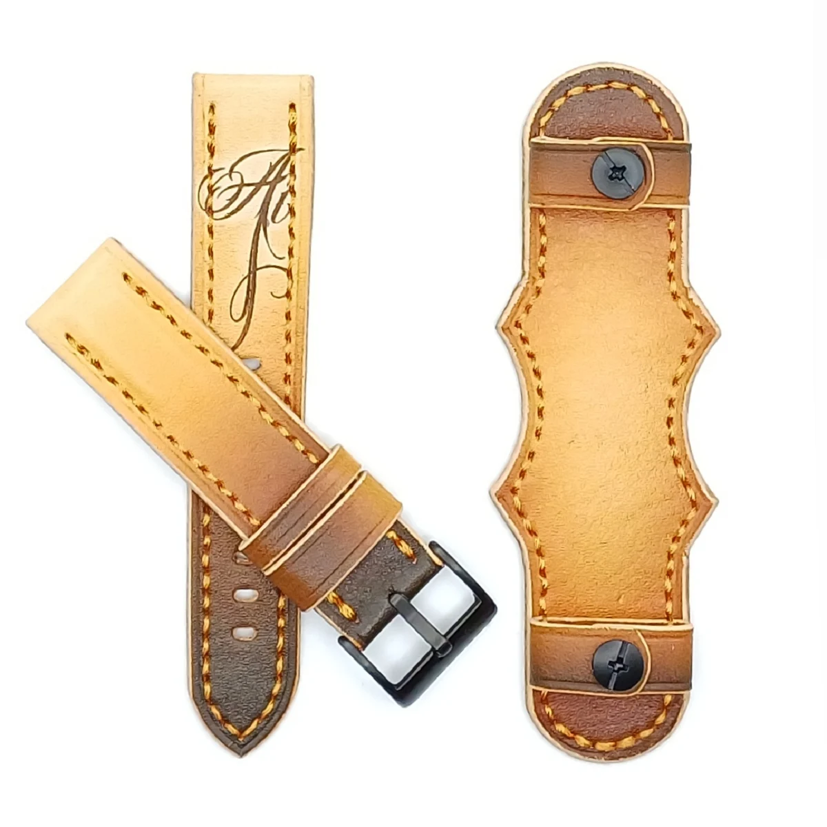 Caractéristiques ✨ Personnalisation Ajoutez une gravure pour rendre votre bracelet unique : Initiales | Ce bracelet de montre en cuir de type Bund se distingue par son plastron central, apportant confort et caractère. La version Aube présente un centre plus clair entouré d’extrémités plus foncées. Ce contraste lumineux met en valeur la montre tout en conservant une esthétique équilibrée. Fabriqué à la main, chaque élément est soigneusement découpé, assemblé et cousu. Le cuir développe avec le temps une patine unique, reflet de son usage. Le plastron central ajoute une présence visuelle plus marquée ainsi qu’un confort supplémentaire au contact du poignet. Inspiré des bracelets historiques, ce modèle Bund affirme un style plus marqué et une identité forte. |